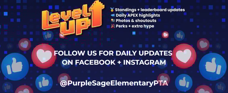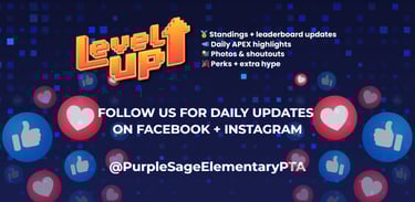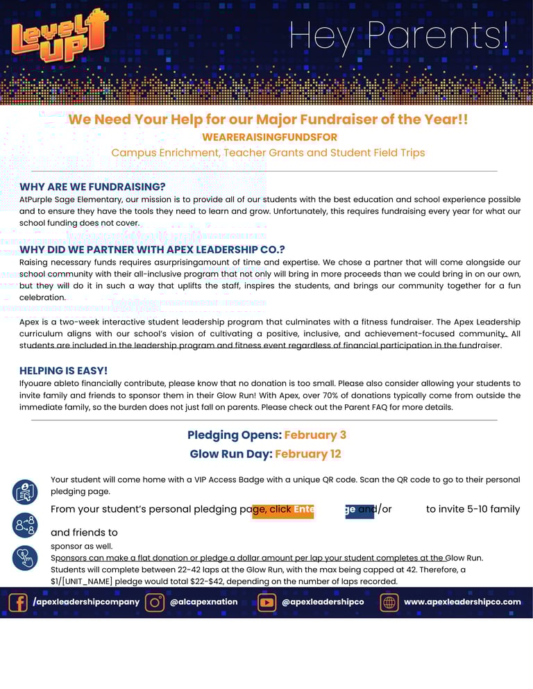 Apex is a 2-week interactive leadership and character-building program combined with a fitness-focused event fundraiser to help Purple Sage raise funds for campus enrichment, field trips, and teacher grants for supplies in the classrooms.