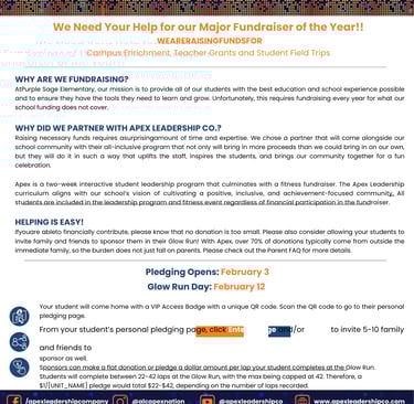 In previous years, we have done this type of fun run on our own and even tried other companies. This has required many many many volunteers (and staff that do not have the time or resources) to form a committee and weeks of planning. After all of their hard work. The fact that Apex can raise over double the amount of our other efforts, give back to the teachers/staff directly, and earn 60% back is amazing!!! When we have researched other fundraisers like cookie dough, wrapping paper etc... all of those companies cap the earnings at 50% back to the school of proceeds earned.